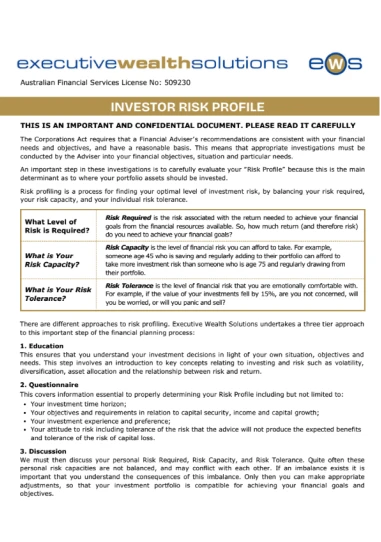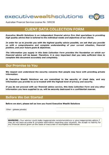 To get started with Executive Wealth Solutions, please download each of the forms below and save them to your computer. Then complete each form and save. Once completed return these forms to us via email, along with any additional paperwork. We will be in contact with you very soon.